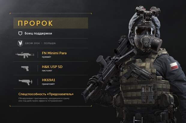 Сам Пророк имеет защитную маску, и отравление на него не действует. После прокачки этот оперативник получает пассивную способность видеть метки противников в дыму постоянно.